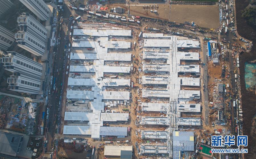 2月4日拍摄的武汉雷神山医院建设工地(无人机照片)。新华社记者 肖艺九 摄
