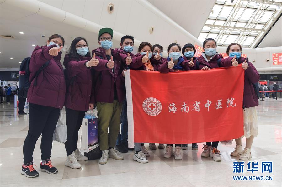 2月4日,在海口美兰机场,医疗队队员在飞赴武汉前合影。 当日,海南省援助湖北护理专业医疗队从海口美兰机场出发,飞赴武汉,支援湖北抗击新型冠状病毒引起的肺炎疫情。 新华社发 (蒲晓旭 摄)