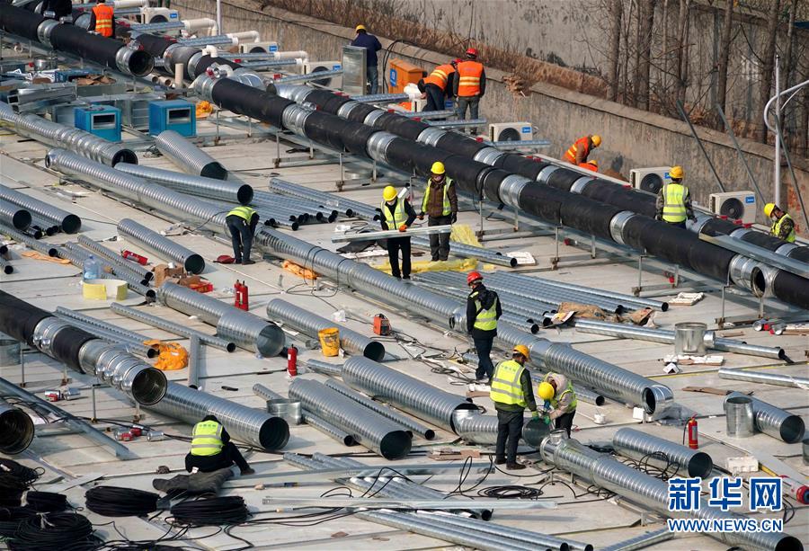 2月4日,施工人员在郑州市第一人民医院传染病医院项目施工现场作业。 当日,经过连日来紧张的施工建设,郑州市第一人民医院传染病医院项目进入收尾阶段,即将建成交付,用于新型冠状病毒感染的肺炎患者的定点救治。 新华社记者 李安 摄
