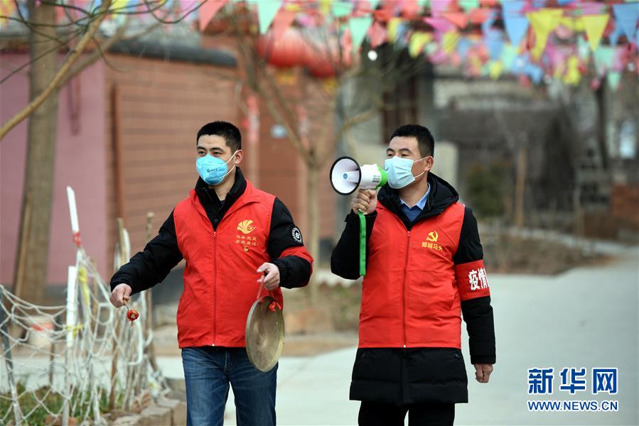2月4日,在山东省临沂市郯城县马头镇杨庄村,两名党员志愿者向村民宣传预防知识。 连日来,为应对新型冠状病毒感染的肺炎疫情,各地对辖区街道、公共设施等进行消毒,对往来人员加强体温检测,落实各项防控工作。 新华社发(房德华 摄)