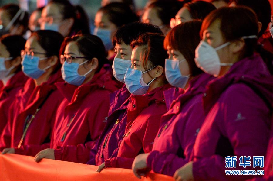 新疆第二批援鄂医疗队队员在出征仪式上(2月4日摄)。 2月4日,新疆第二批援助湖北省抗击新型冠状病毒感染的肺炎医疗队出征。102名从克拉玛依市、吐鲁番市、喀什地区等5个地州市多家医院抽调的医护人员前往武汉驰援。截至目前,新疆共派出两批244名医护人员奔赴武汉抗击疫情。 新华社记者 丁磊 摄