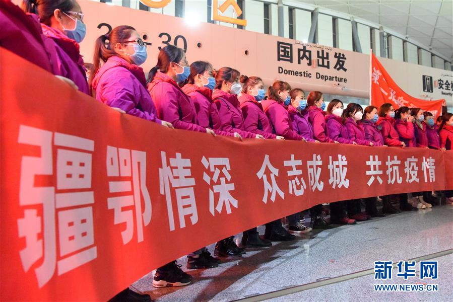 新疆第二批援鄂医疗队队员在出征仪式上(2月4日摄)。 2月4日,新疆第二批援助湖北省抗击新型冠状病毒感染的肺炎医疗队出征。102名从克拉玛依市、吐鲁番市、喀什地区等5个地州市多家医院抽调的医护人员前往武汉驰援。截至目前,新疆共派出两批244名医护人员奔赴武汉抗击疫情。 新华社记者 丁磊 摄