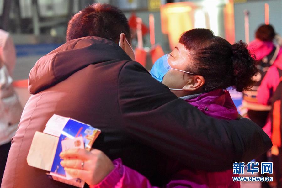 新疆第二批援鄂医疗队队员陈晖(右)出发前与家人拥抱道别(2月4日摄)。 2月4日,新疆第二批援助湖北省抗击新型冠状病毒感染的肺炎医疗队出征。102名从克拉玛依市、吐鲁番市、喀什地区等5个地州市多家医院抽调的医护人员前往武汉驰援。截至目前,新疆共派出两批244名医护人员奔赴武汉抗击疫情。 新华社记者 丁磊 摄