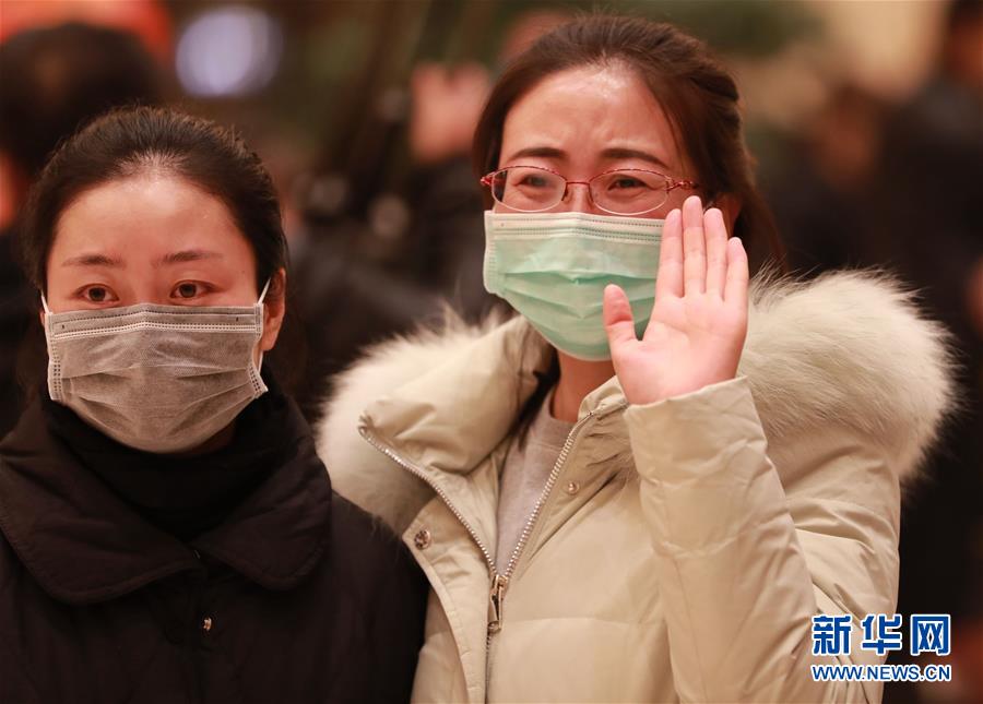 2月4日,甘肃省第二批援鄂护理专业医疗队队员的亲属和医疗队队员告别。 2月5日凌晨,甘肃省第二批援鄂护理专业医疗队出发前往武汉。医疗队由甘肃省13个市州、53家各级医疗机构派出的100名护理专业人员组成。 新华社发(杜哲宇 摄)