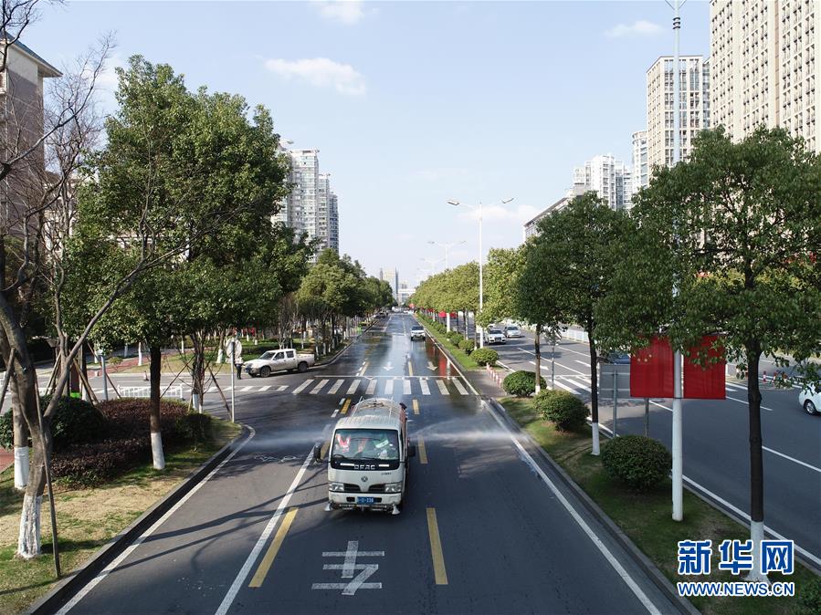 2月5日,一台洒水车在长沙岳麓区道路上喷洒消毒液(无人机照片)。 为应对新型冠状病毒感染的肺炎疫情,1月22起,长沙市每日出动9000余名环卫工人,700余台洗扫车、人机配合清洗车对主次干道、商圈、农贸市场等重点区域进行清扫,对公共垃圾站、公共厕所以及果皮箱及时进行清洗并消毒。 新华社记者 薛宇舸 摄