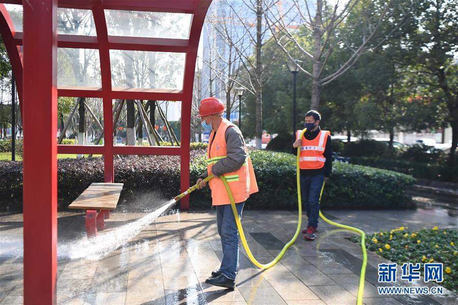 2月5日,环卫工人在长沙岳麓区街头人行道上喷洒消毒液。 为应对新型冠状病毒感染的肺炎疫情,1月22起,长沙市每日出动9000余名环卫工人,700余台洗扫车、人机配合清洗车对主次干道、商圈、农贸市场等重点区域进行清扫,对公共垃圾站、公共厕所以及果皮箱及时进行清洗并消毒。 新华社记者 薛宇舸 摄