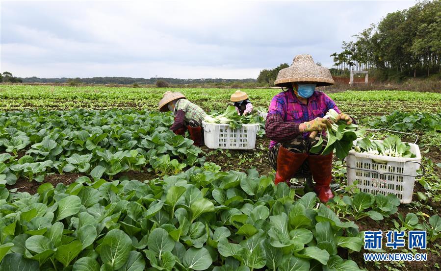 2月5日,在海口市琼山区红旗镇七水洋蔬菜种植基地,工人在收获蔬菜。 近日,海口市菜篮子集团组织人员在蔬菜种植基地收获蔬菜,扩大蔬菜供应量。 新华社记者 杨冠宇 摄