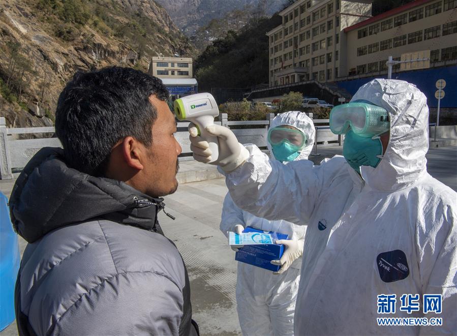 聂拉木海关关员赵静(中)和同事对入境人员进行体温测量并发放一次性口罩(1月29日摄)。新华社记者 孙非 摄