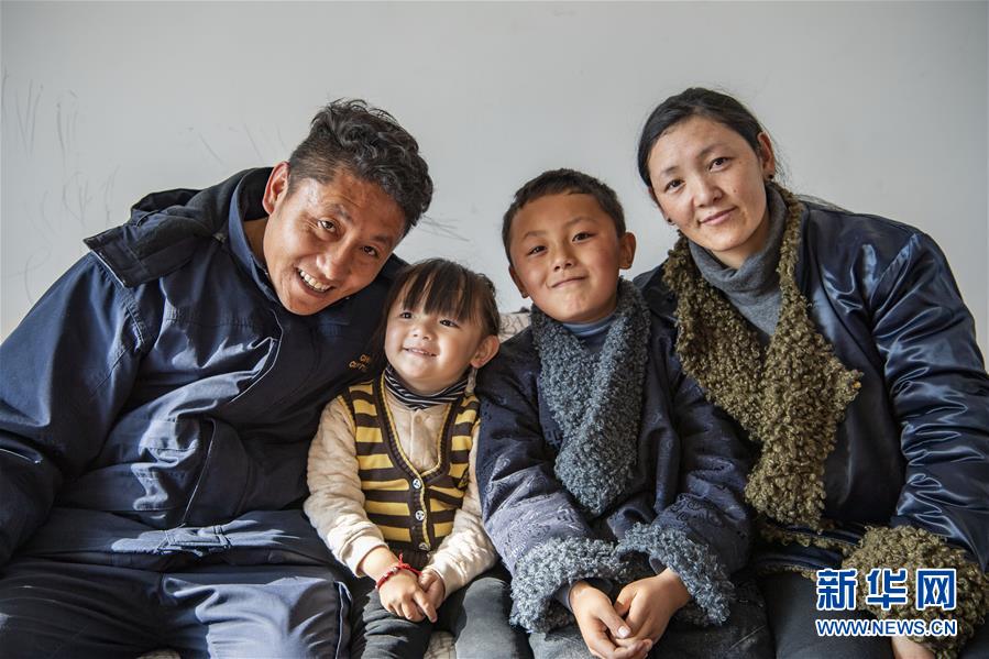 聂拉木海关协管员阿旺次仁(左)一家四口合影(1月27日摄)。新华社记者 孙非 摄