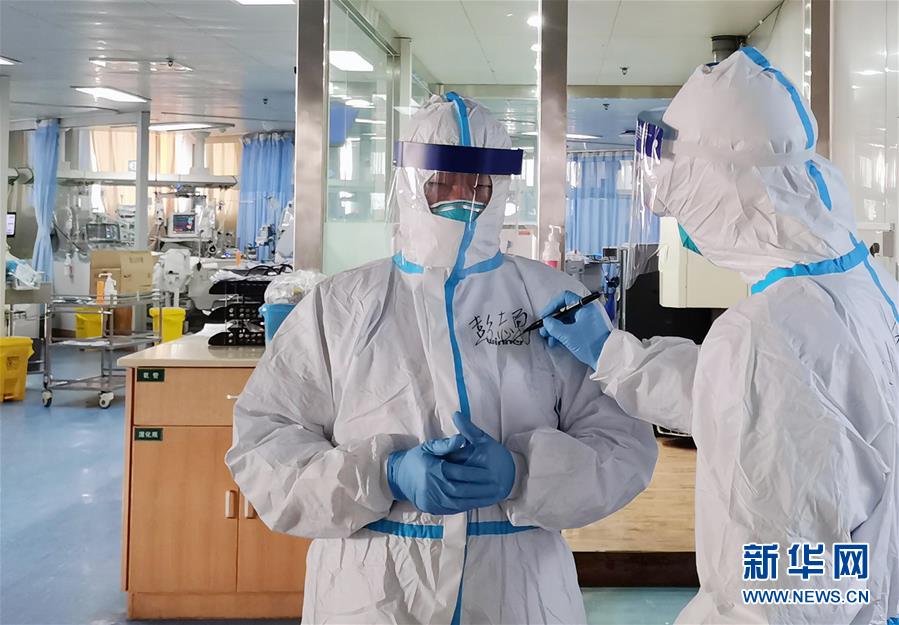 2月5日,武汉大学中南医院重症医学科主任彭志勇(左)走进隔离病房准备救治患者,一名医生在他的隔离服上写下名字(手机拍摄)。 进入隔离病房后,因为穿了厚重的隔离服,医护人员之间很难认出对方。他们在隔离服上互相写下名字,方便辨认。 新华社发(钟南轩 摄)