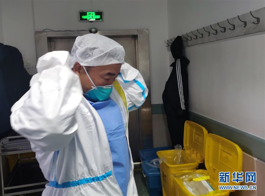 2月5日,在武汉大学中南医院重症医学科隔离病房准备区,重症医学科主任彭志勇穿上隔离服,准备救治患者(手机拍摄)。 新华社发(钟南轩 摄)