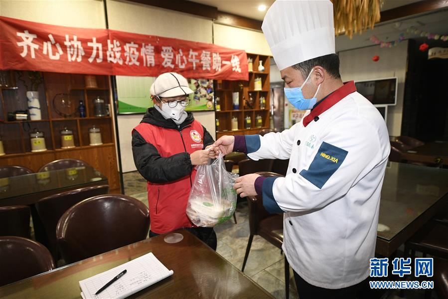 2月5日,宁夏银川宁味楼餐饮员工为社区工作人员提供爱心午餐。新华社记者王鹏摄