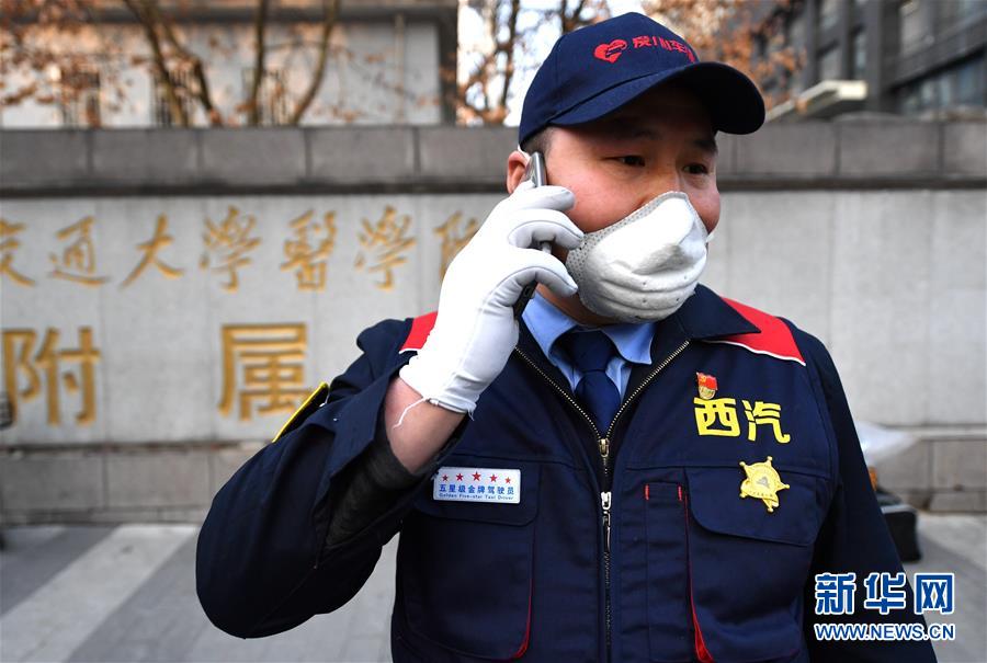 2月5日,王锋利在医院门前与乘车医务人员联系。新华社记者 张博文 摄
