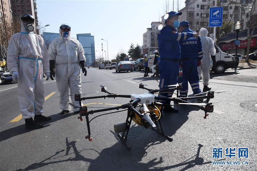 2月5日,一架无人机在青岛西海岸新区一小区准备起飞,进行空中消杀作业。 当日,青岛市借助无人机配合地面防疫人员,对高密度居民小区进行空中防控消毒作业。据介绍,一架普通植保无人机每次可携带10公斤左右消毒液,单次喷洒面积可覆盖5000平方米。 新华社记者 李紫恒 摄