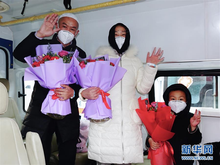 2月5日,在青海省第四人民医院,治愈患者挥手致意。 当日,青海3名新型冠状病毒感染的肺炎患者经过省级医疗救治专家组的指导和定点收治医院的精心治疗,已符合国家出院标准,正式出院。 新华社发(张海东 摄)