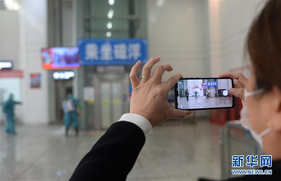 2月5日,在长沙磁浮高铁站站内,一名旅客在拍摄长沙蓝天救援队队员杀菌消毒作业场景。新华社发(陈振海摄)