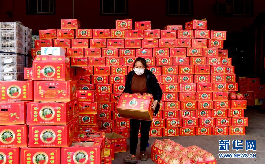 2月4日,在河南万邦批发市场果蔬区,工作人员在整理水果。新华社记者 朱祥 摄