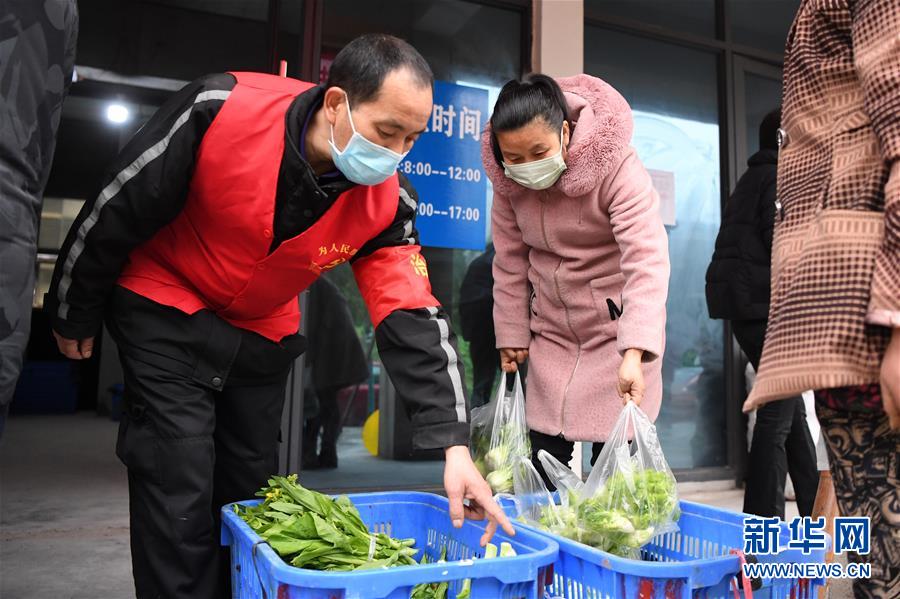 2月6日,当地居民在志愿者的协助下在社区蔬菜自助超市选购蔬菜。新华社记者 唐奕 摄