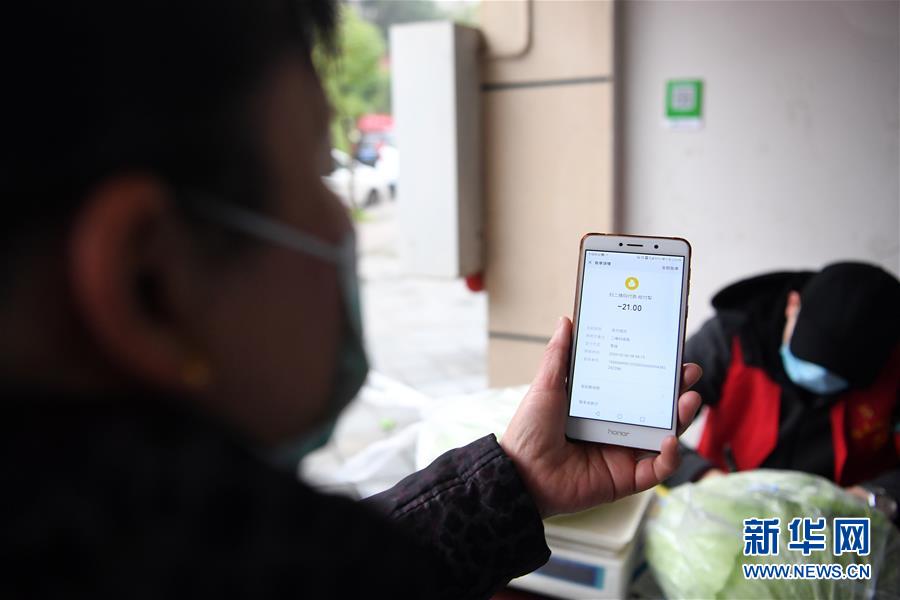 2月6日,当地居民在社区蔬菜自助超市选购蔬菜后扫码付款。新华社记者 唐奕 摄