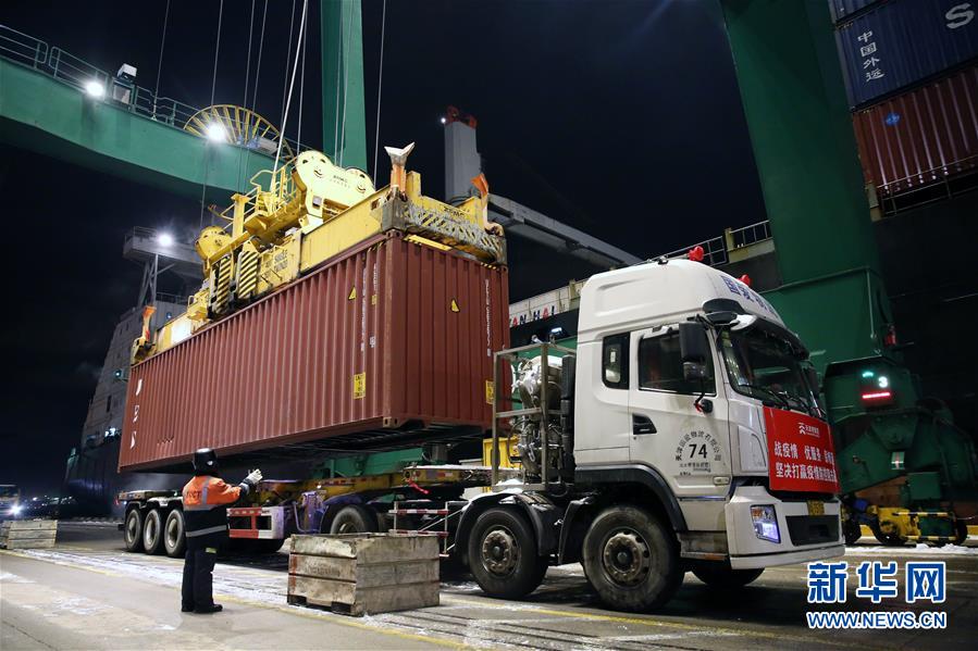 2月5日,天津港集团连夜抢卸、发运“南星马克利夫”轮和“东方强”轮上的疫情防控物资。新华社发