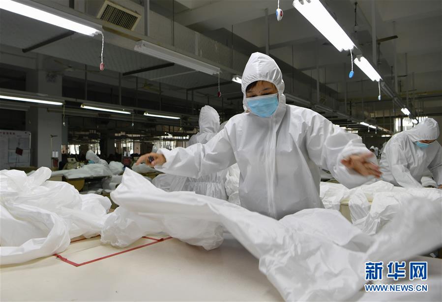 2月6日,在位于福建省莆田市城厢区的才子服饰股份有限公司生产车间,工人在打包生产好的非医用防护服。新华社记者 魏培全 摄