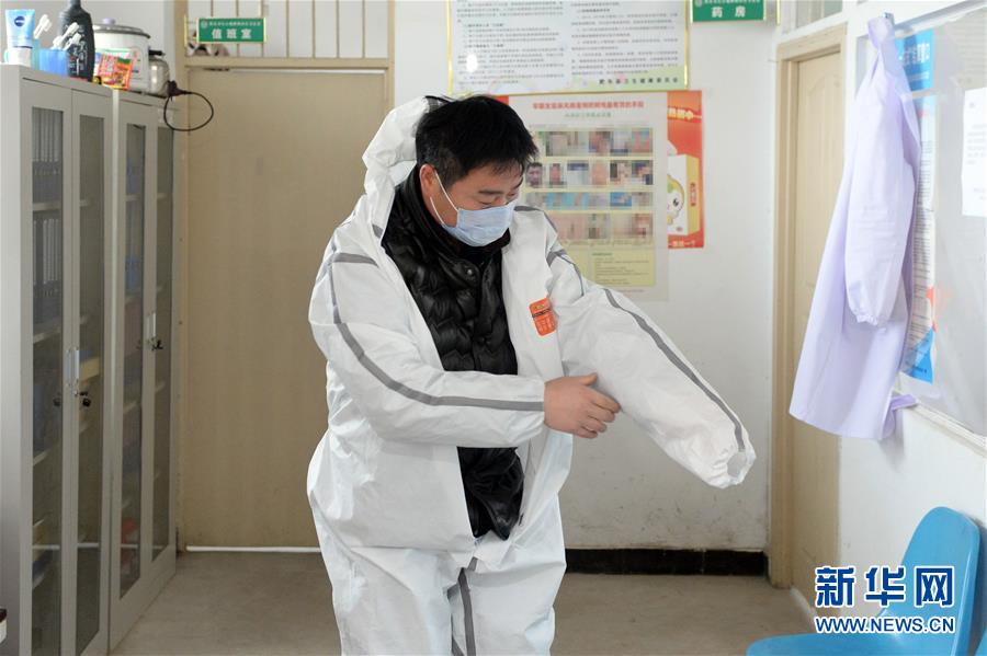 2月6日,崔爱国穿上防护服,准备去为居家隔离人员测量体温。新华社发(黄博涵 摄)