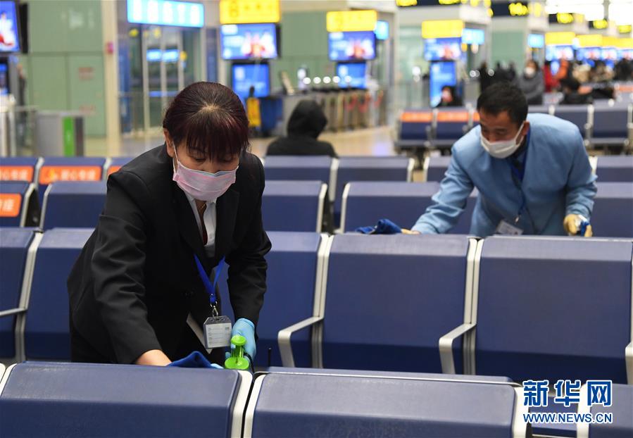 2月6日,在北京南站,工作人员在对候车室内的座椅进行消毒。 为做好新型冠状病毒感染的肺炎疫情防控工作,北京南站加强对站内重点区域的消毒频次,通过设置红外测温仪等方式对进、出站旅客进行体温监测,全力保障旅客安全。 新华社发(任超摄)