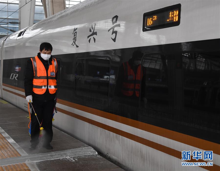 2月6日,工作人员在北京南站的站台上进行消毒。 为做好新型冠状病毒感染的肺炎疫情防控工作,北京南站加强对站内重点区域的消毒频次,通过设置红外测温仪等方式对进、出站旅客进行体温监测,全力保障旅客安全。 新华社发(任超 摄)