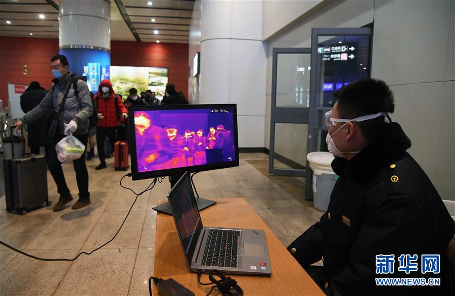 2月6日,在北京南站出站口,工作人员通过红外测温仪对出站旅客的体温进行监测。 为做好新型冠状病毒感染的肺炎疫情防控工作,北京南站加强对站内重点区域的消毒频次,通过设置红外测温仪等方式对进、出站旅客进行体温监测,全力保障旅客安全。 新华社发(任超 摄)