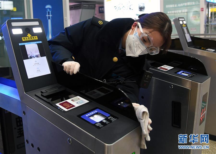 2月6日,在北京南站,工作人员在对站内的闸机进行消毒。 为做好新型冠状病毒感染的肺炎疫情防控工作,北京南站加强对站内重点区域的消毒频次,通过设置红外测温仪等方式对进、出站旅客进行体温监测,全力保障旅客安全。 新华社发(任超摄)