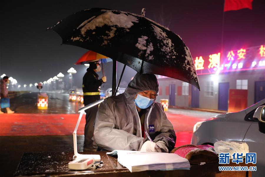 2月5日深夜,在沪陕高速公路洛南县华阳站进城方向,防疫联防人员在对车辆进行登记。新华社发(陈亚民 摄)