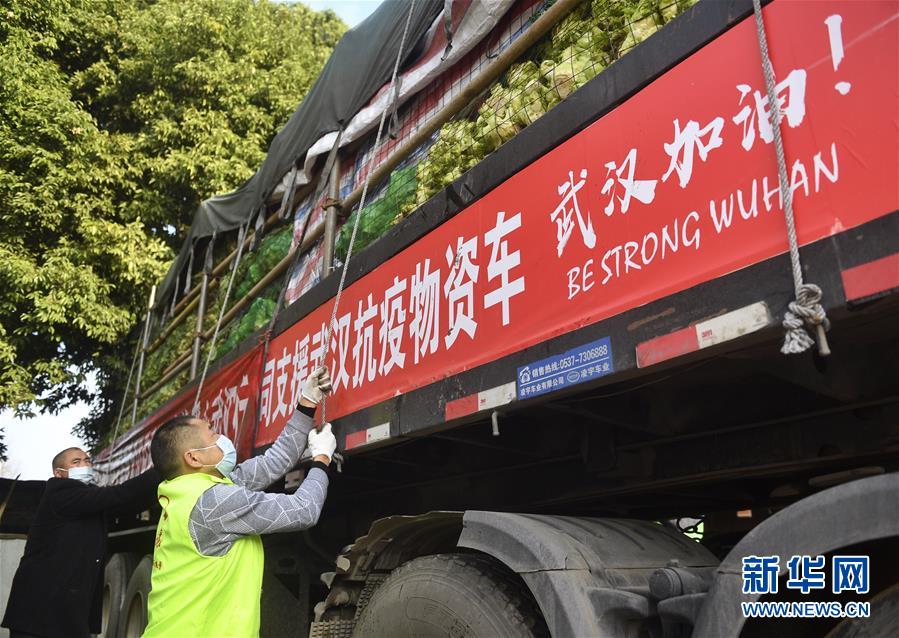 2月6日,志愿者在将蔬果装车。 当日,共载有300余吨蔬菜水果的17辆货车从四川省成都市蒲江县寿安镇出发前往武汉。据了解,这批蔬果的捐赠由公益组织发起,成都的20多家农业专合社、家庭农场、爱心团体和企业参与。 新华社记者 刘坤 摄