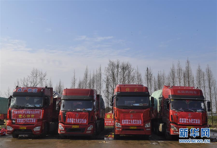 2月6日,运送蔬果的货车整装待发。 当日,共载有300余吨蔬菜水果的17辆货车从四川省成都市蒲江县寿安镇出发前往武汉。据了解,这批蔬果的捐赠由公益组织发起,成都的20多家农业专合社、家庭农场、爱心团体和企业参与。 新华社记者 刘坤 摄