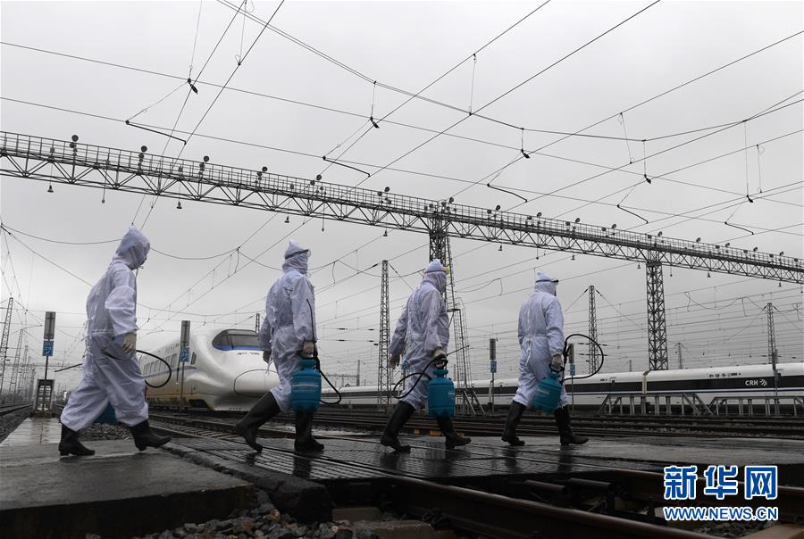 2月6日,在中国铁路南宁局集团有限公司南宁动车所,中国铁路南宁局集团有限公司疾控中心工作人员走向动车准备开展消杀作业。