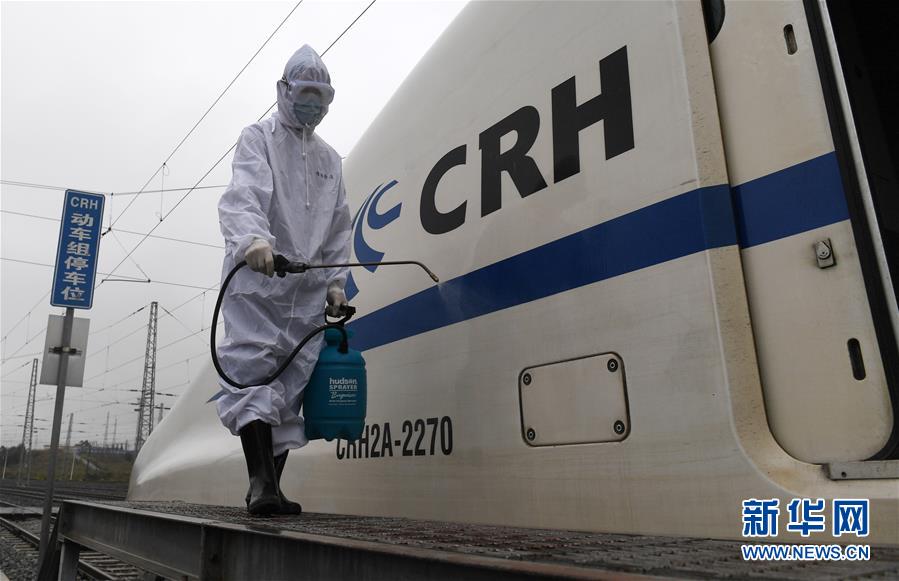 2月6日,在中国铁路南宁局集团有限公司南宁动车所,中国铁路南宁局集团有限公司疾控中心工作人员对一列动车进行消杀作业。 新华社记者 陆波岸 摄