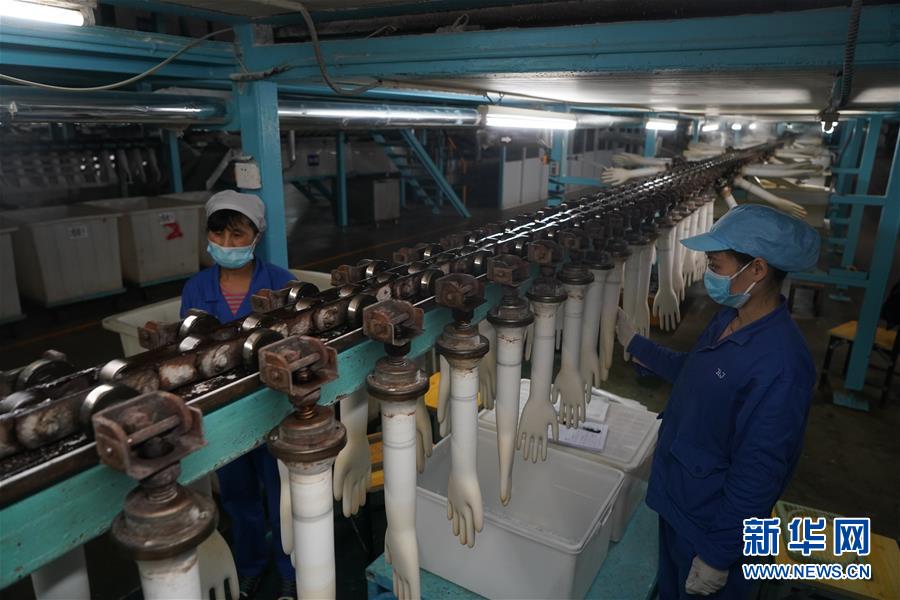2月6日,工人在生产线上检查手套模具。季春鹏 摄