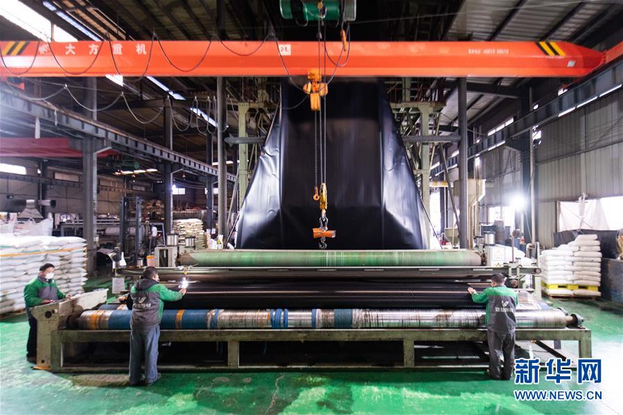 2月6日,在湖南宁乡经开区长沙建益新材料有限公司,工作人员在赶制防渗材料。 当日,在湖南宁乡经开区,长沙建益新材料有限公司的员工正在加紧赶制防止医疗废弃物污染土壤和地下水的防渗防护材料。 新型冠状病毒感染的肺炎疫情防控工作启动以来,该公司已为武汉火神山医院、武汉雷神山医院、广州市第八人民医院嘉禾院区临时防疫区等隔离医院的施工建设发送共约40万平方米的防渗防护材料。 新华社发(陈思汗摄)