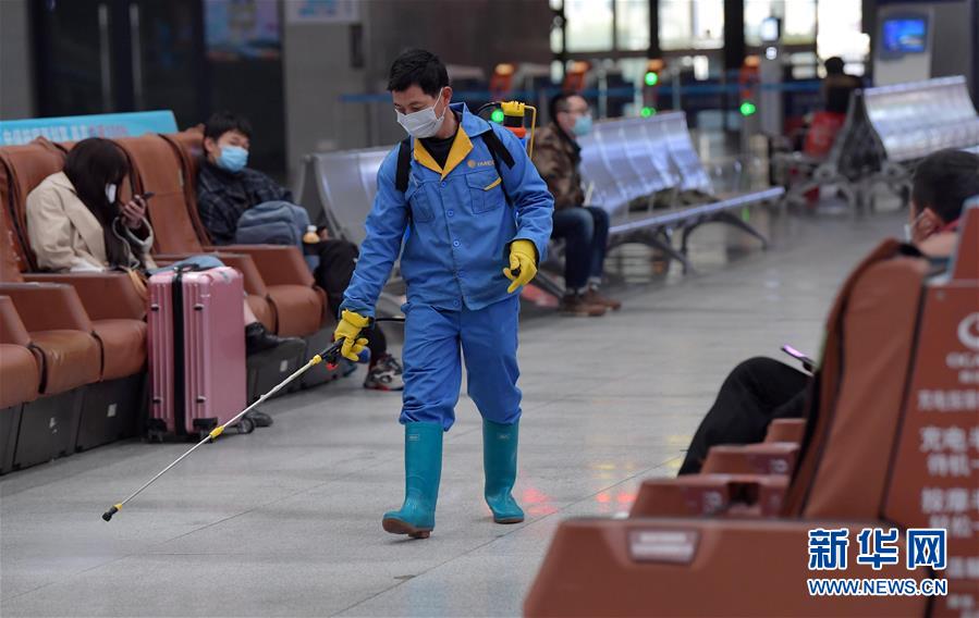 2月6日,在中国铁路南昌局集团有限公司南昌站,工作人员进行消毒作业。新华社记者 彭昭之 摄