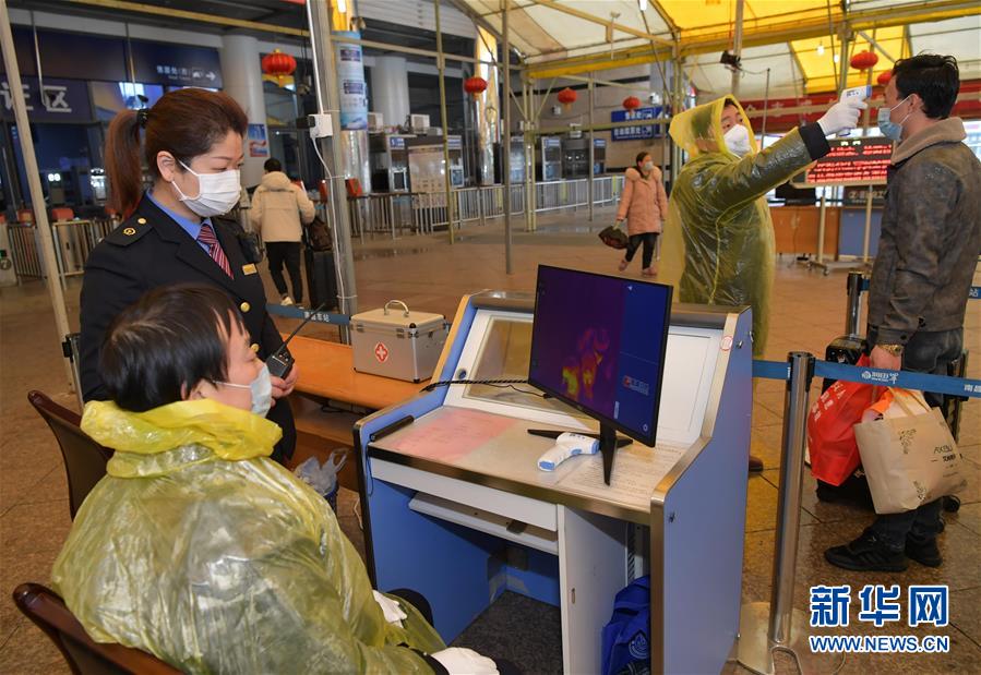 2月6日,在中国铁路南昌局集团有限公司南昌站,工作人员对进站旅客测量体温,同时,红外线热成像体温测量设备也在进行监测。新华社记者 彭昭之 摄
