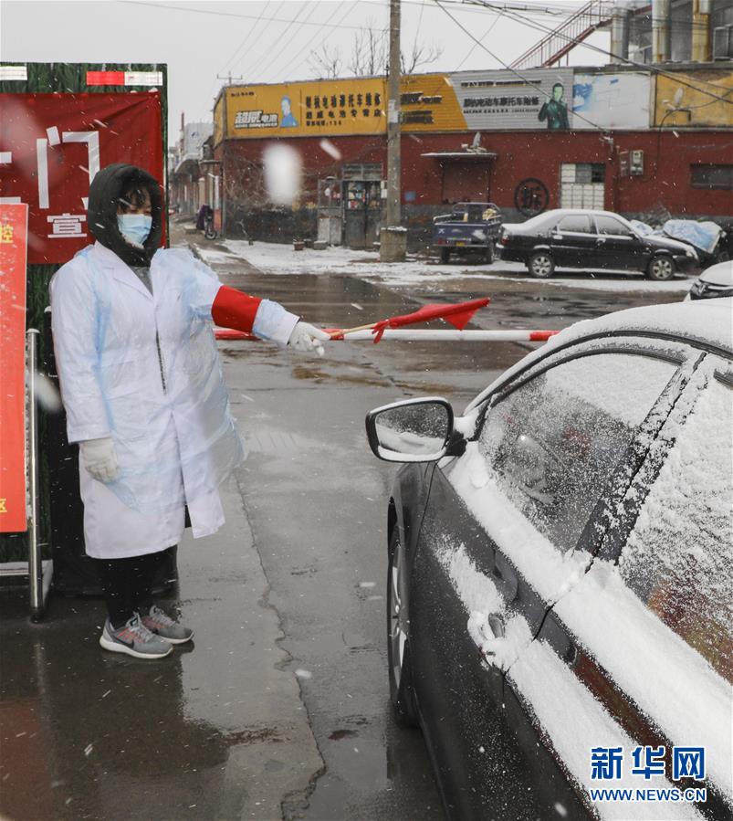 2月6日,山东省临沂市兰山区银雀山街道梨杭社区卡口,志愿者在风雪中值守。新华社发(许传宝 摄)