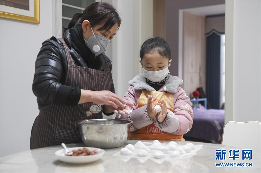 2月6日,重庆市云阳县海峡小学一年级学生周彦希在家人的指导下学习包汤圆。新华社记者 王全超 摄