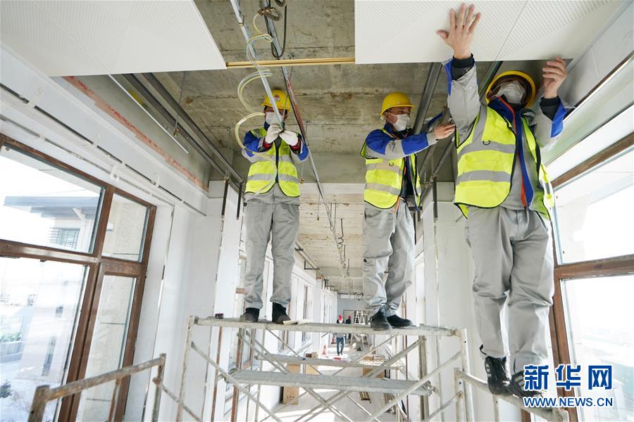 2月6日,工人在黑龙江省集中救治定点医院施工现场加紧施工。 当日,记者探访了正在改造施工中的黑龙江省新型冠状病毒感染的肺炎患者集中救治定点医院。从2月1日进场起,建设单位黑龙江省建工集团二建公司日均投入近200人,24小时不间断施工,并计划于15日交工。黑龙江省集中救治定点医院位于哈尔滨市平房区,为黑龙江省中医药大学附属第二医院哈南分院按符合甲类传染病救治标准改造,改造完成后,医院将从原来的500张床位增至1000张。 新华社记者王建威摄