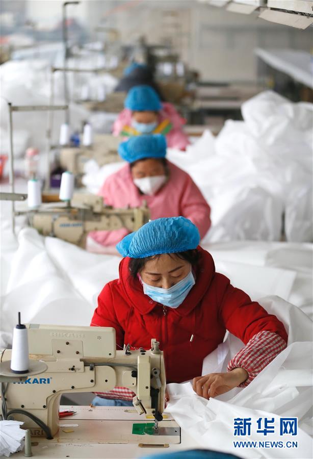 2月6日,在山东省青岛市即墨区的青岛卫康利医疗器械有限公司生产车间,工人在加紧生产防护服。新华社发