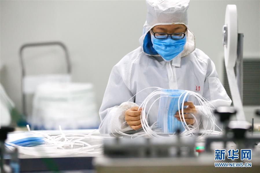 2月6日,在山东省青岛市即墨区的青岛卫康利医疗器械有限公司生产车间,工人在加紧生产口罩。新华社发