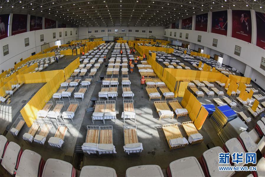 2月4日,工人在武汉客厅对“方舱医院”加紧施工。新华社记者 程敏 摄