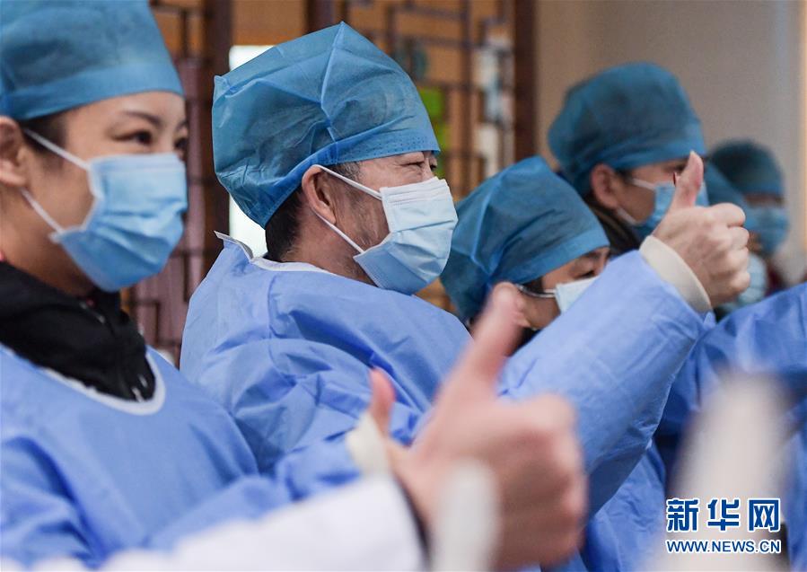 2月6日,由湖北省中西医结合医院治愈的新型冠状病毒肺炎患者在出院前为自己加油鼓劲。 当日,来自湖北省中西医结合医院和武汉市中医医院的23名新型冠状病毒肺炎治愈患者集体出院。这些患者都是经过中西医结合治疗后康复的。 新华社记者 李贺 摄