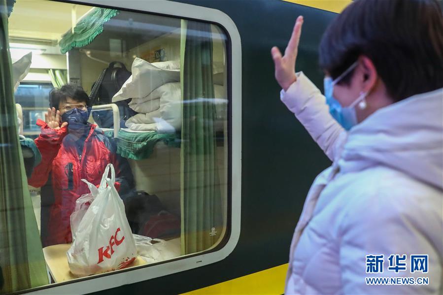 2月6日,一名北京大学国际医院医疗队队员在北京西站的列车上与同事挥手告别。 当日,由20名北京大学国际医院医护专家组成的支援湖北抗疫国家医疗队,乘坐火车驰援湖北。这支医疗队由呼吸与危重症医学科、急诊科、感染疾病科、麻醉科、胸外科等多个科室的8名医生、12名护士组成。当日12时40分接到国家卫健委正式任务通知后,北京大学国际医院迅速部署应急医疗队人员选派和后勤物资保障。短短3小时之后,一支以党员为主的20人骨干团队迅速集结完毕,整装待发。 新华社记者 张玉薇 摄