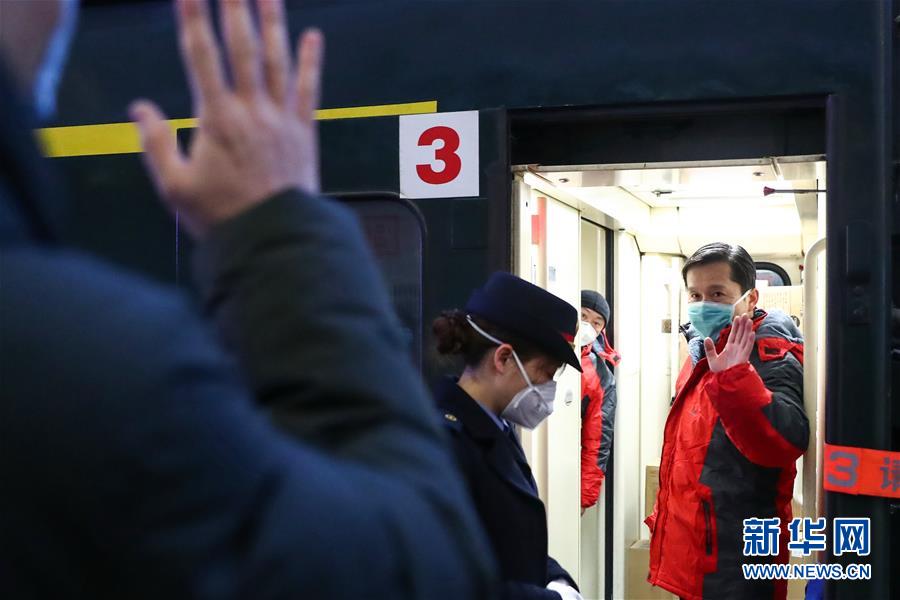 2月6日,北京大学国际医院医疗队队员秦宇红(右)在北京西站的列车上挥手告别。 当日,由20名北京大学国际医院医护专家组成的支援湖北抗疫国家医疗队,乘坐火车驰援湖北。这支医疗队由呼吸与危重症医学科、急诊科、感染疾病科、麻醉科、胸外科等多个科室的8名医生、12名护士组成。当日12时40分接到国家卫健委正式任务通知后,北京大学国际医院迅速部署应急医疗队人员选派和后勤物资保障。短短3小时之后,一支以党员为主的20人骨干团队迅速集结完毕,整装待发。 新华社记者 张玉薇 摄