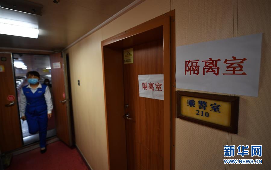这是客滚轮上设立的隔离室(2月6日摄)。 琼州海峡是进出海南岛的大通道,新型冠状病毒感染的肺炎疫情防控工作启动以来,海南省联合广东省,双双将防控关口前移。海南将关口前移至广东省湛江市,派驻160余名多部门联合防疫人员,设立4个防控点和一个留观点。此外,海南省还在过海轮渡上通过登船前体温检测、船舶消毒、设立隔离室等多种措施,做好疫情防控工作。 新华社记者 郭程 摄