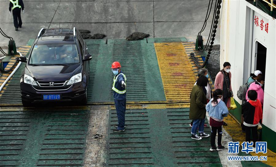 2月6日,海口秀英港轮渡码头工作人员指挥人员和车辆登船。 琼州海峡是进出海南岛的大通道,新型冠状病毒感染的肺炎疫情防控工作启动以来,海南省联合广东省,双双将防控关口前移。海南将关口前移至广东省湛江市,派驻160余名多部门联合防疫人员,设立4个防控点和一个留观点。此外,海南省还在过海轮渡上通过登船前体温检测、船舶消毒、设立隔离室等多种措施,做好疫情防控工作。 新华社记者 郭程 摄